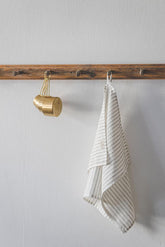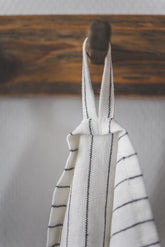 Weiße Geschirrtücher aus Leinen mit schwarzen Streifen. Wunderschön gefertigt aus hochwertigem europäischem Leinen mit natürlicher Textur.