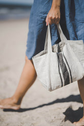 Leinenhandtasche im französischen Stil mit schwarzen Streifen. Wunderschön gefertigt aus hochwertigem europäischem Leinen, mit zusätzlichem Leinenfutter innen. Die perfekte Tasche für kleine Dinge für einen langen Tag.