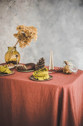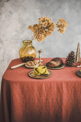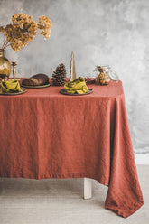 Terrakottafarbene Leinentischdecke mit Gehrungsecken. Wunderschön gefertigt aus hochwertigem europäischem Leinen mit natürlicher Textur.
