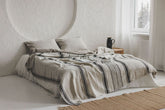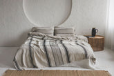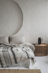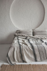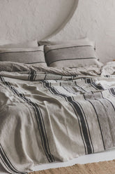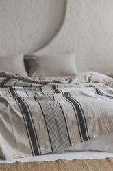Leinen-Tagesdecke im französischen Stil mit schwarzen Streifen. Diese Tagesdecke aus 100 % natürlichem Leinen verbindet rustikale Eleganz mit moderner Schlichtheit und ist somit die perfekte Ergänzung für jedes Zuhause.