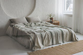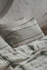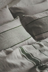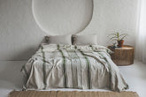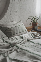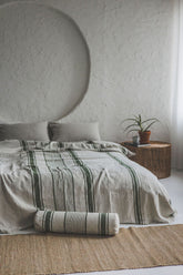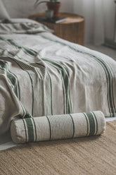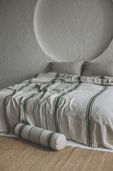 Leinen-Tagesdecke im französischen Stil mit grünen Streifen. Diese Tagesdecke aus 100 % natürlichem Leinen verbindet rustikale Eleganz mit moderner Schlichtheit und ist somit die perfekte Ergänzung für jedes Zuhause.