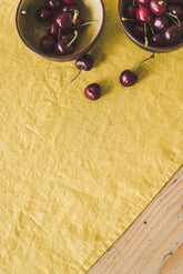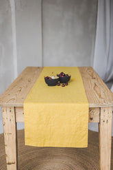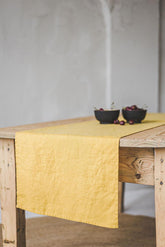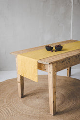 Tischläufer aus mimosengelbem Leinen. Wunderschön gefertigt aus hochwertigem europäischem Leinen mit natürlicher Textur.