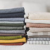 10 schwere, weiche Leinenmuster. (Natur, Anthrazit, Kamel, Waldgrün, Gebranntes Orange, Weiß/Natur gestreift, Olivgrün, Ozeanblau, Terrakotta, Natur mit schwarzen Streifen)