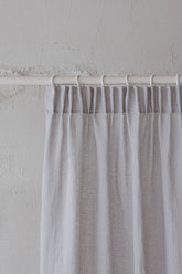 Transparenter Leinenvorhang mit Bleistiftfalten an einem regnerischen Tag